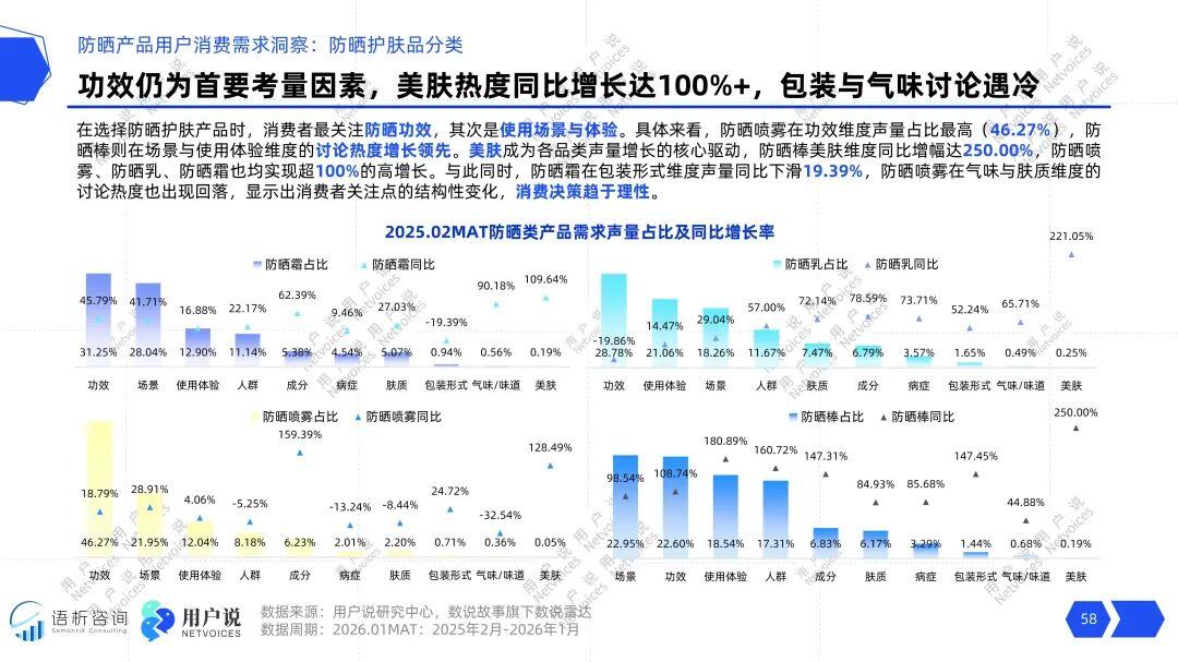拆解用户对防晒产品的具体需求,一个清晰的二元结构显现。一方面,防晒功效本身仍是不可动摇的决策基石,防晒喷雾在功效维度46.27%的声量占比即是证明。另一方面,美肤成为驱动增长的最强引擎。